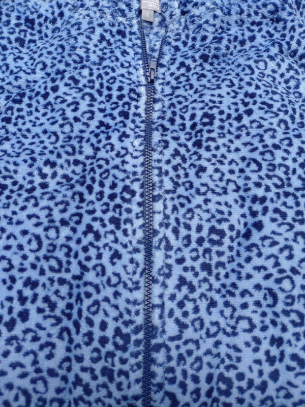Gemaakt van 100% polyester fleece- lekker zacht met all-over luipaardprint wat een speelse en trendy uitstraling geeft. boorden aan de mouwen en broekspijpen, steekzakken en een capuchon ronden het geheel af.